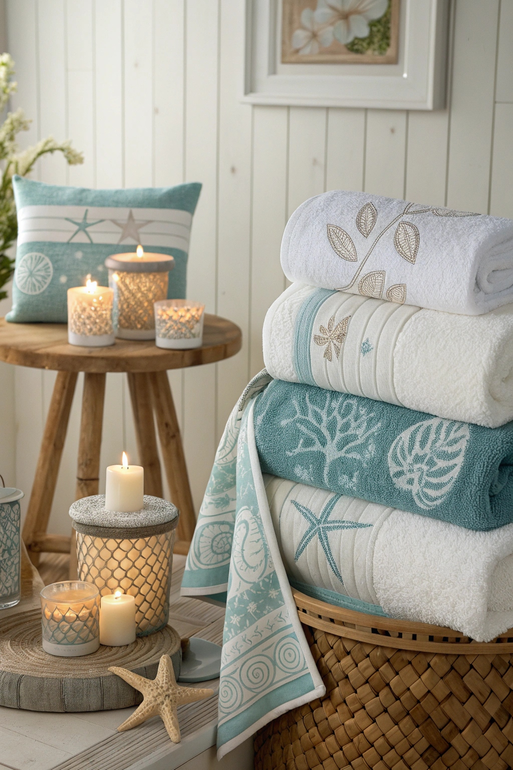 High-quality cotton towels offer softness and absorbency, while bamboo or natural fiber mats provide durability and complement the coastal aesthetic. Choose solid colors or subtle nautical patterns for a cohesive look.
