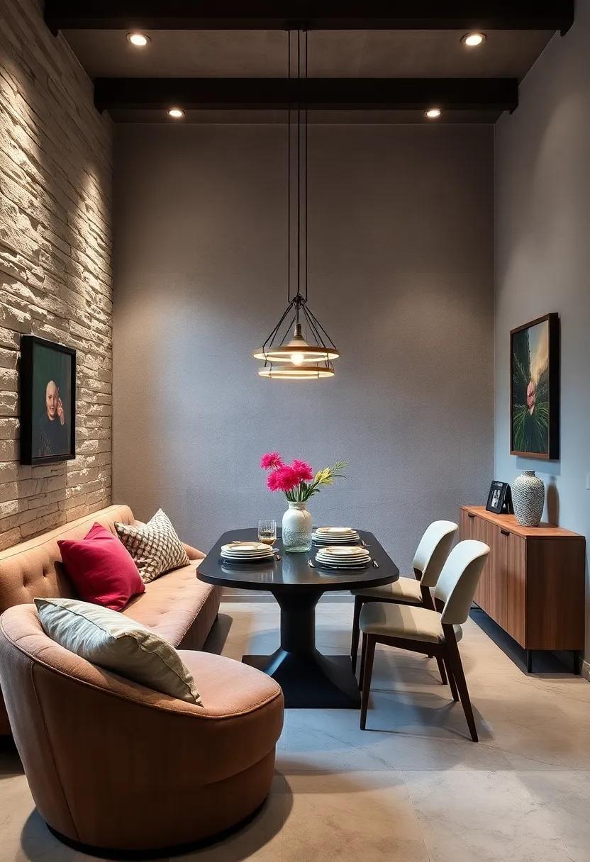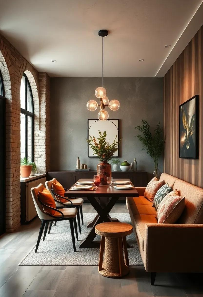 Lighting plays an integral role in setting the mood within a small dining room. Opt for a stylish chandelier or a cluster of pendant lights that draw the eye upward, creating an illusion of more space. Place a few softly glowing candles around the table for that extra layer of intimacy. Consider using a thoughtful mix of natural elements, such as potted herbs or decorative bowls filled with seasonal fruits, to create an organic touch that invites nature indoors. To keep everything cohesive, choose a harmonious color palette that weaves through your decor, from table settings to wall colors, ensuring a seamless and inviting ambiance.