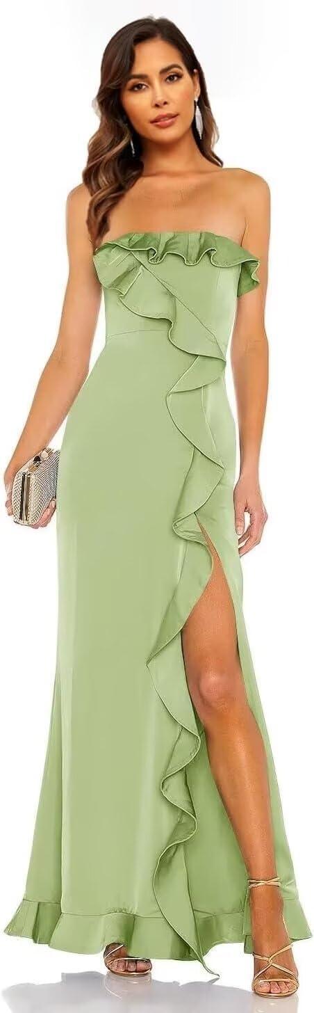 The design of this stunning satin dress incorporates a strapless silhouette complemented by delicate tassel ruffles and a stylish slit,making it an excellent choice for bridesmaids or wedding guests. Its floor-length style and lace-up back offer a flattering fit that enhances the wearer’s figure while adding a sense of sophistication. Available in a range of vibrant colors, this dress caters to various wedding themes and personal preferences, ensuring that everyone in the bridal party can look and feel their best.