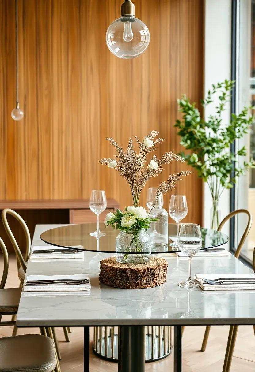 Transform your glass dining table into a serene sanctuary by incorporating natural elements that enhance its rustic elegance. Consider adding organic textures to create a warm, inviting atmosphere. Here are some ideas: