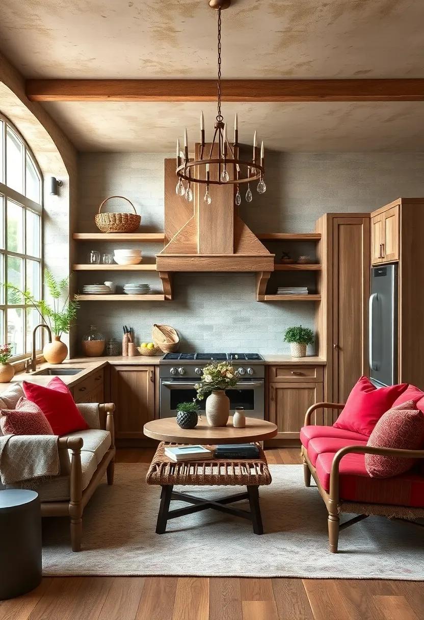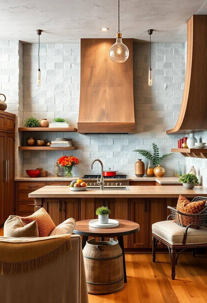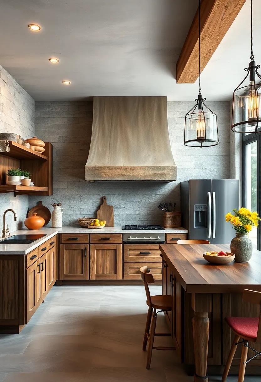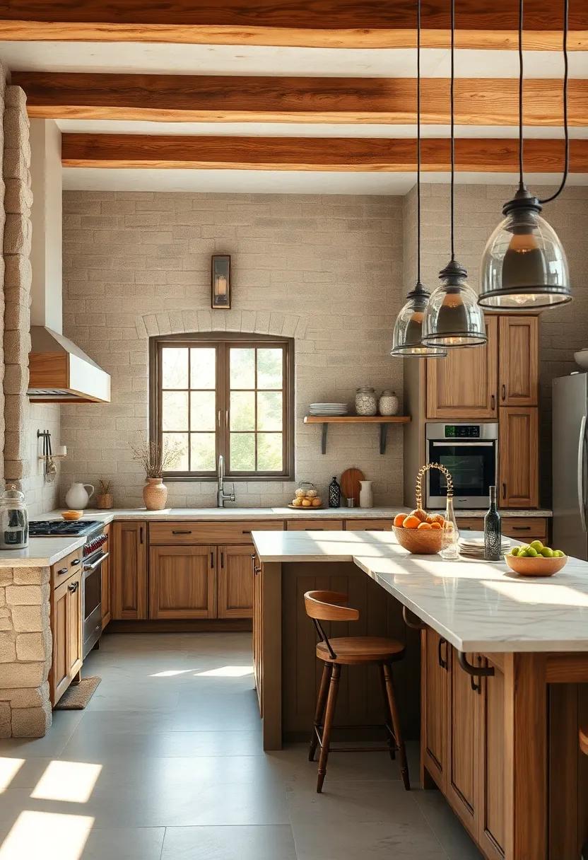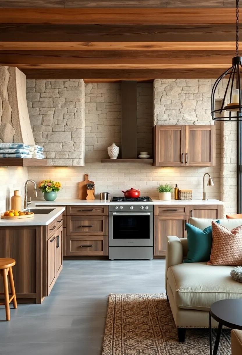 A seamless integration of these elements not only enhances the kitchen’s aesthetic but also allows for practical use of space while maintaining the warmth and inviting feel of a rustic home.