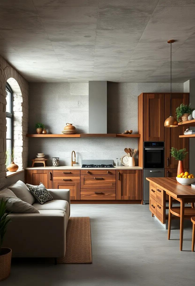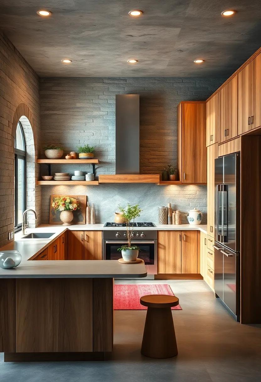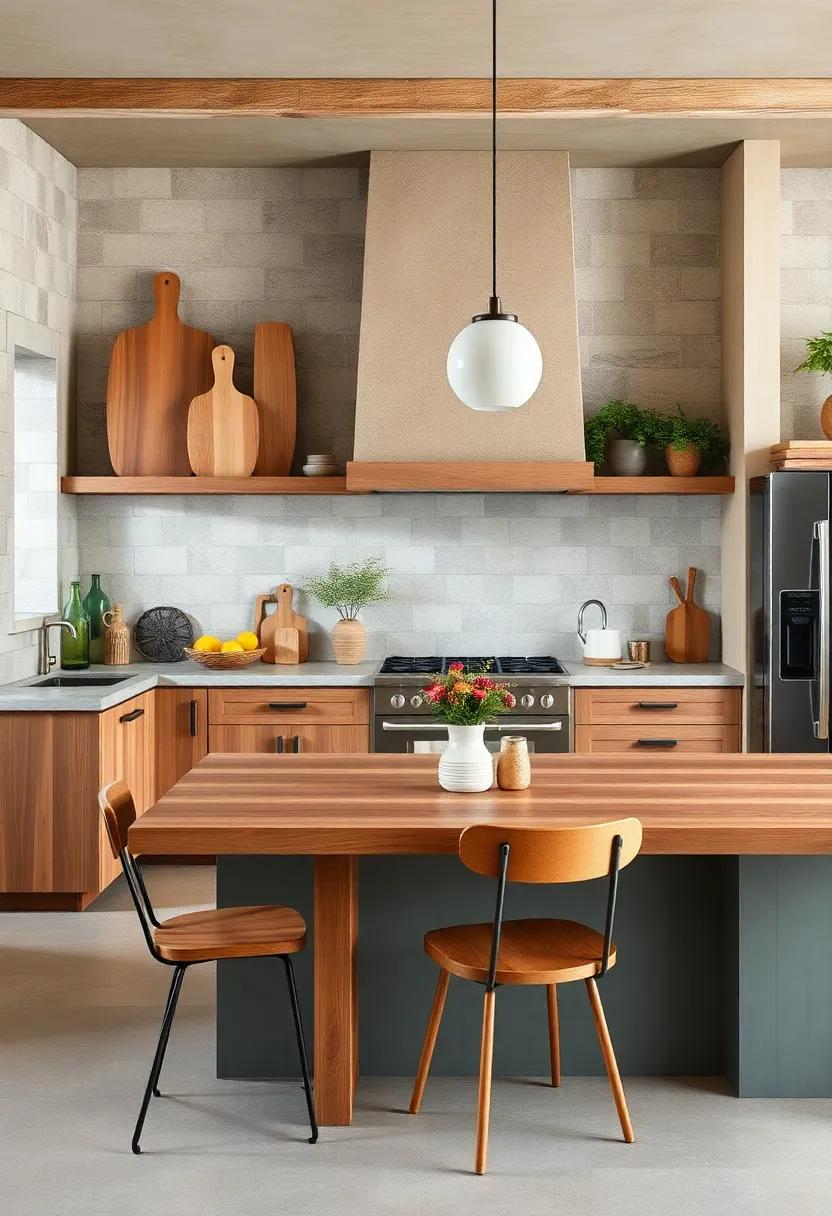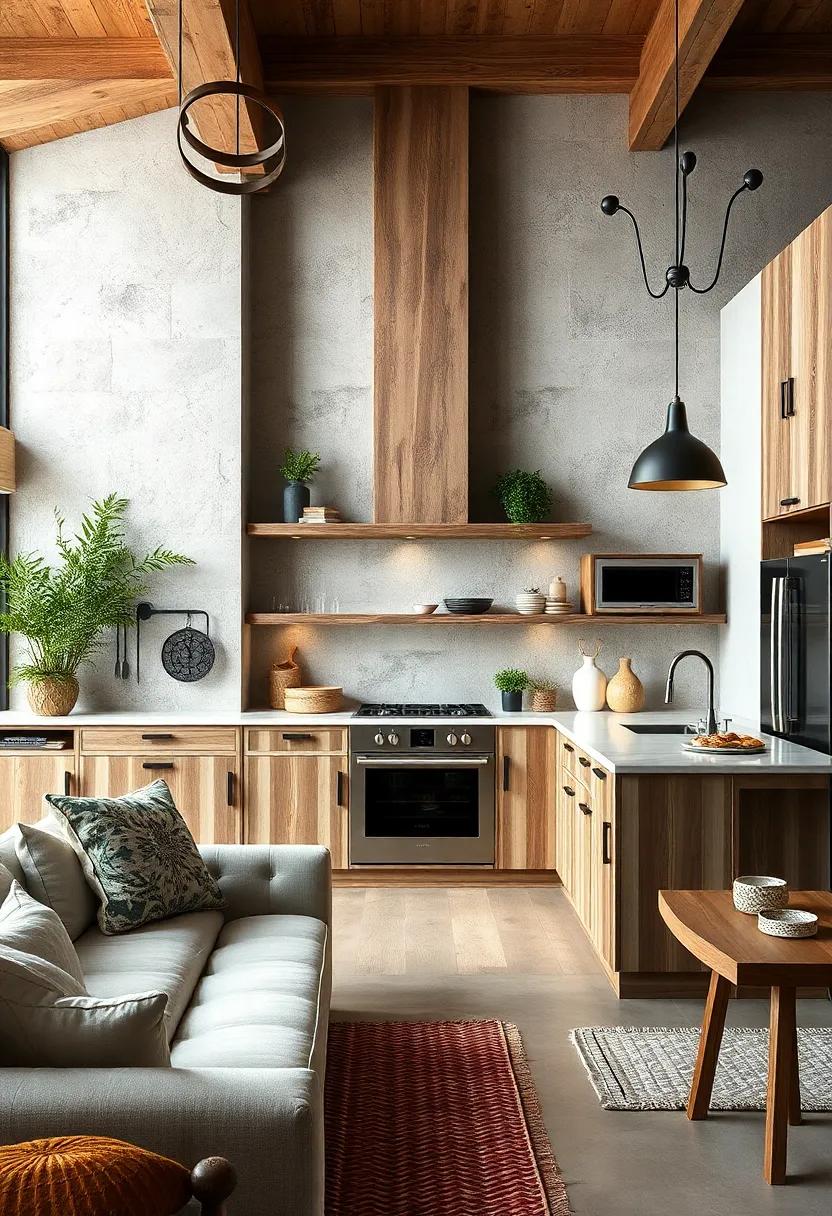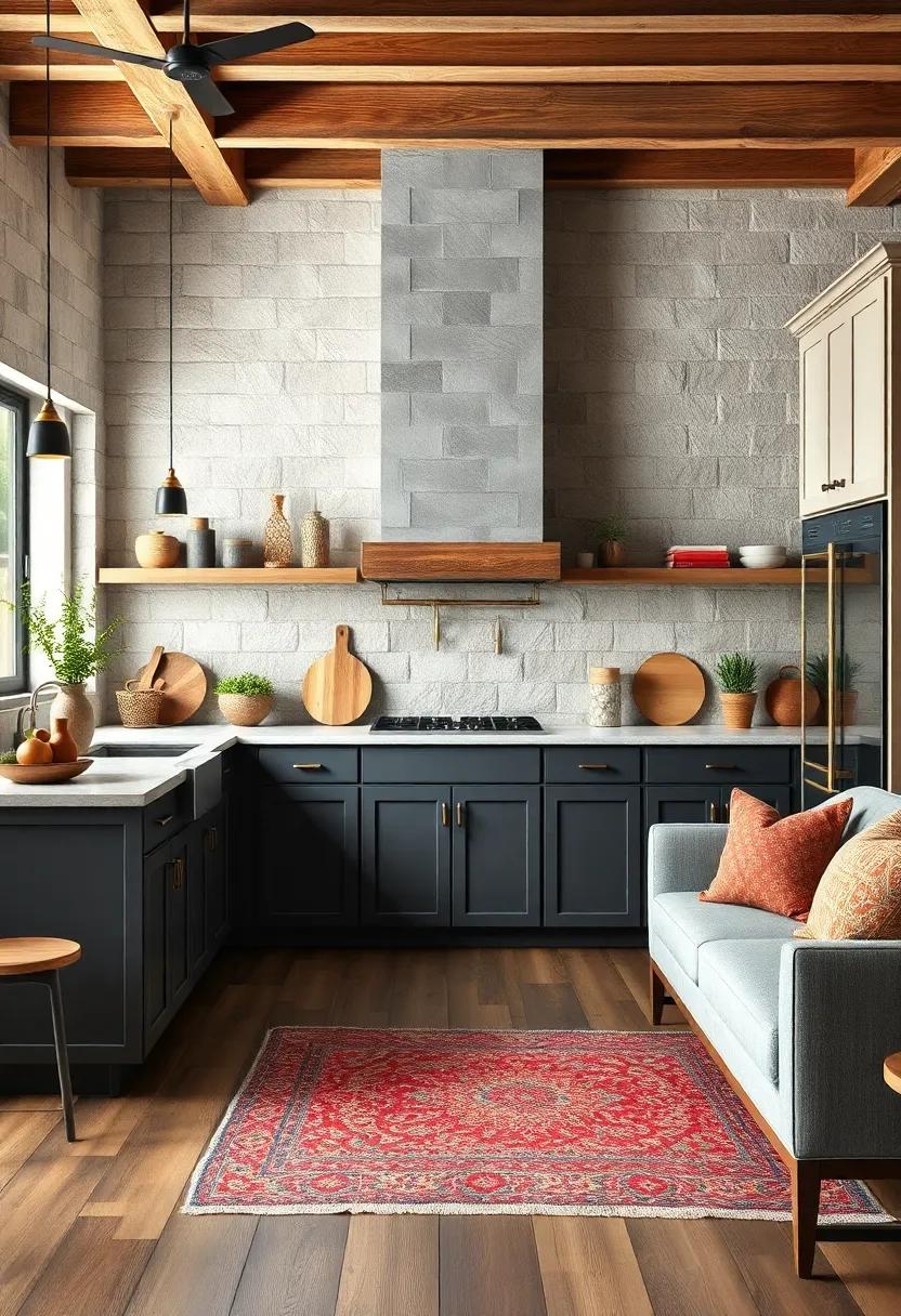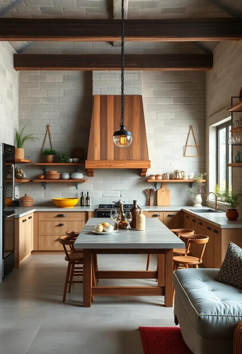 A seamless integration of these elements not only enhances the kitchen’s aesthetic but also allows for practical use of space while maintaining the warmth and inviting feel of a rustic home.