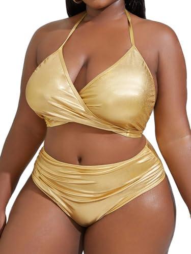 - “WDIRARA Plus Size Metallic Wrap Halter Bikini Set”