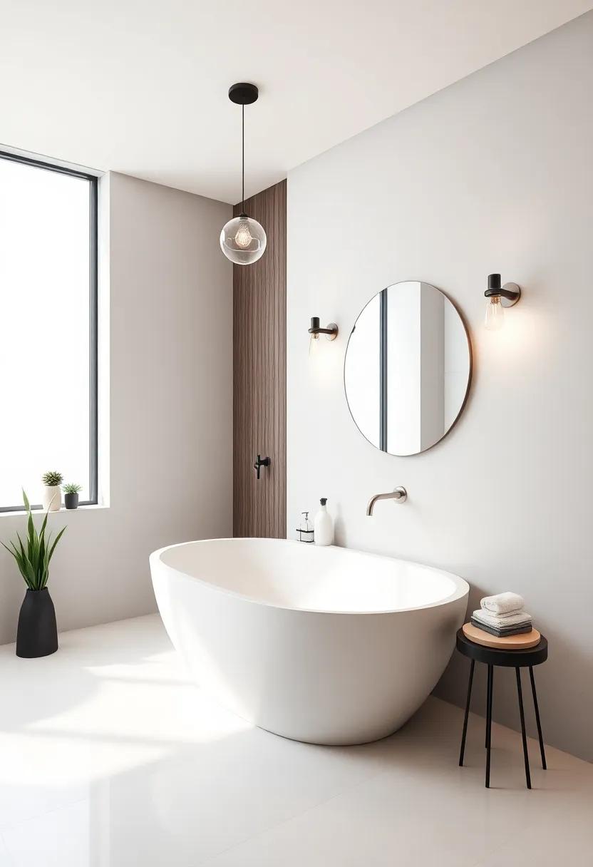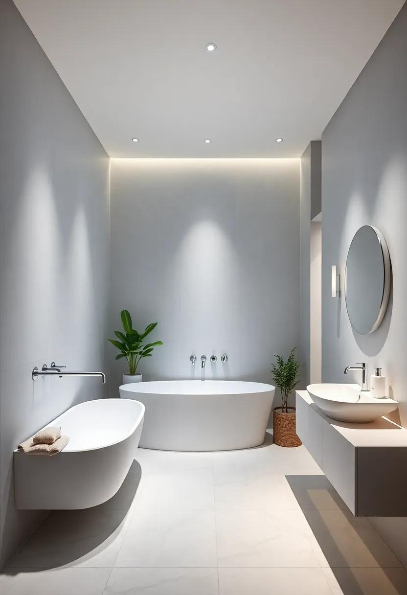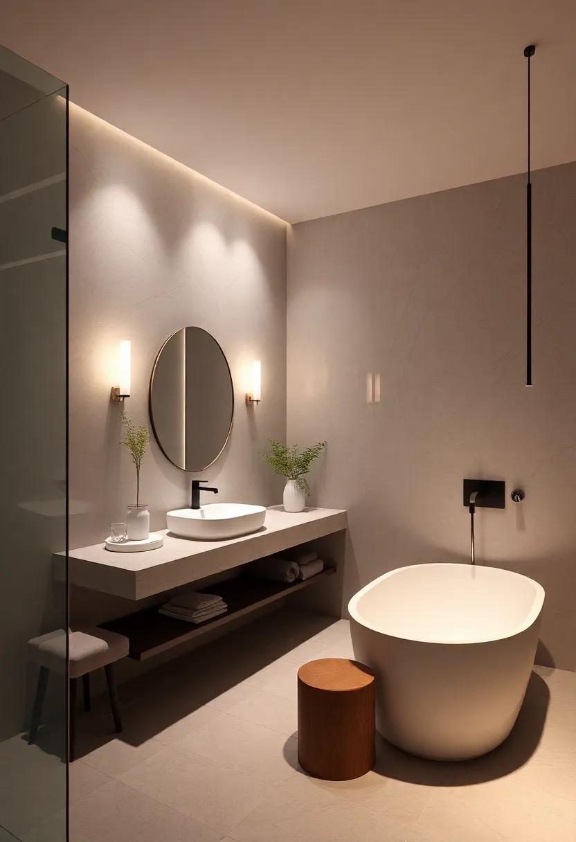 To further accentuate a minimalist decor, explore the use of LED strip lights as they can be discreetly placed for an ethereal glow along shelves or under vanities. This technique not only highlights your design choices but also offers a warm ambiance perfect for unwinding. Additionally, create a cohesive look with a subtle color palette; opt for fixtures in brushed nickel or matte black to maintain a sleek, understated elegance. The interaction of light with simple surfaces, paired with minimalist decor, results in a harmonious retreat that promotes relaxation and rejuvenation.