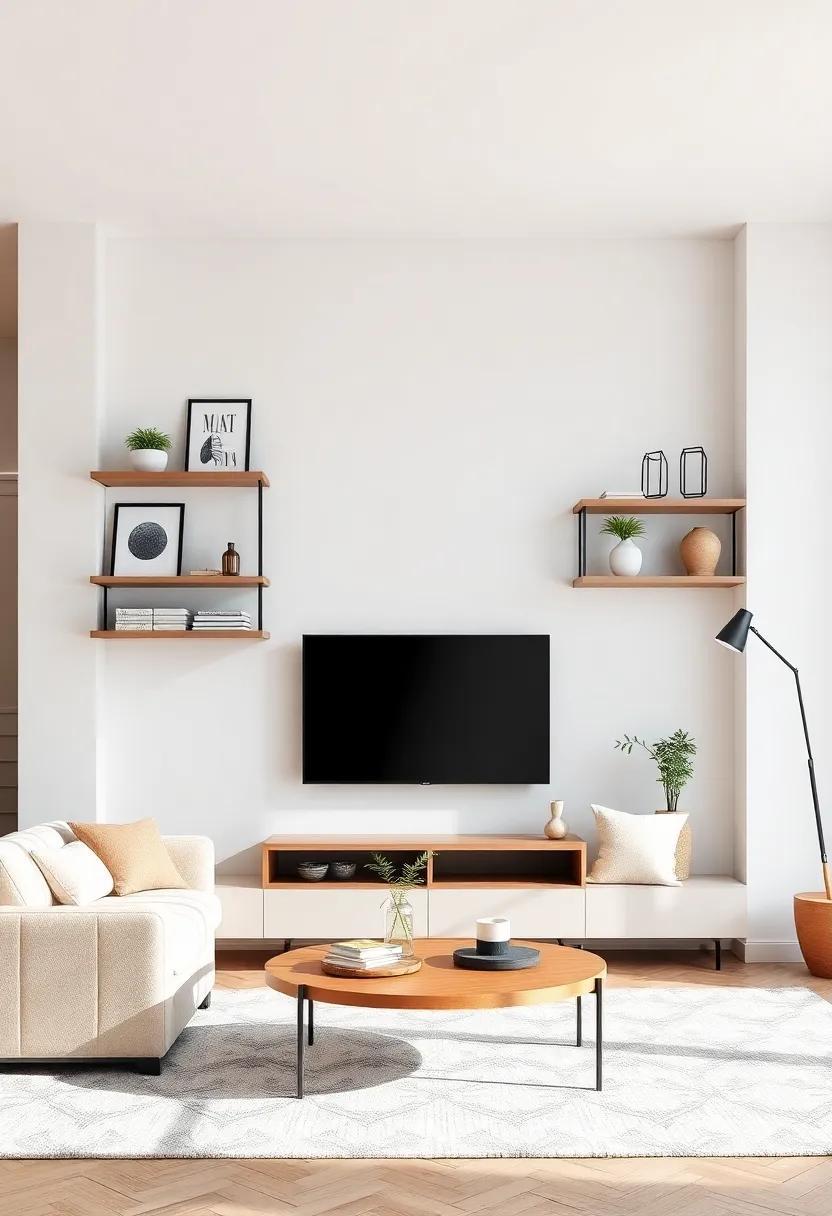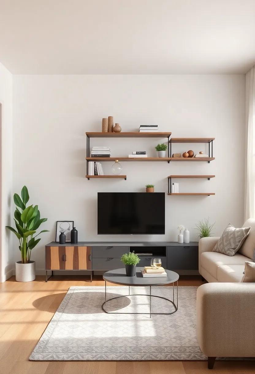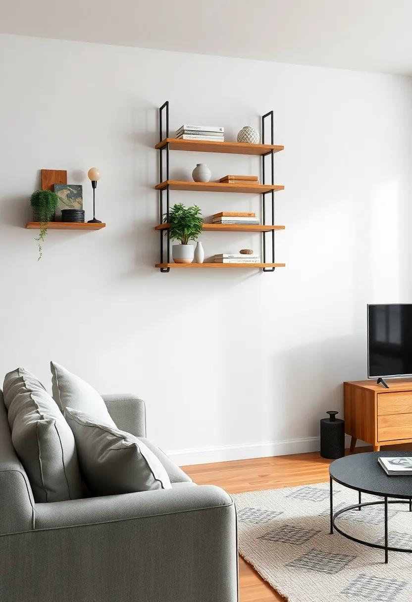 By focusing on these design principles, you can transform your wall shelves into an eye-catching centerpiece that maximizes both space and style in your apartment living room.
