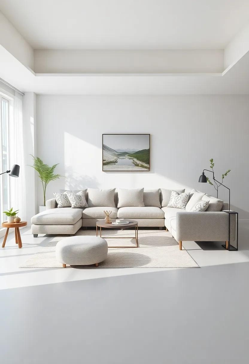 To create a light and airy ambiance in a living room with a large sectional, it’s essential to focus on color palettes and textures that promote an open feel. Begin by choosing soft, neutral shades for the walls and the sectional upholstery, such as whites, creams, or light grays. These colors reflect natural light and make the space feel larger. Accentuate the freshness with the use of light fabrics for throw pillows and blankets, such as linen or cotton, in pastel hues or subtle patterns. Additionally, incorporating mirrors can greatly enhance the brightness of the room by reflecting light and creating the illusion of depth. placing a large mirror opposite a window can dramatically amplify the natural light entering the room.