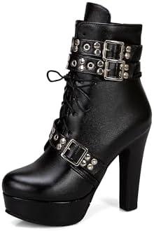 ForeMode Women’s Goth Leather Block Heel Ankle Boots Fashion Studded Ankle Strap Trim Punk Boots