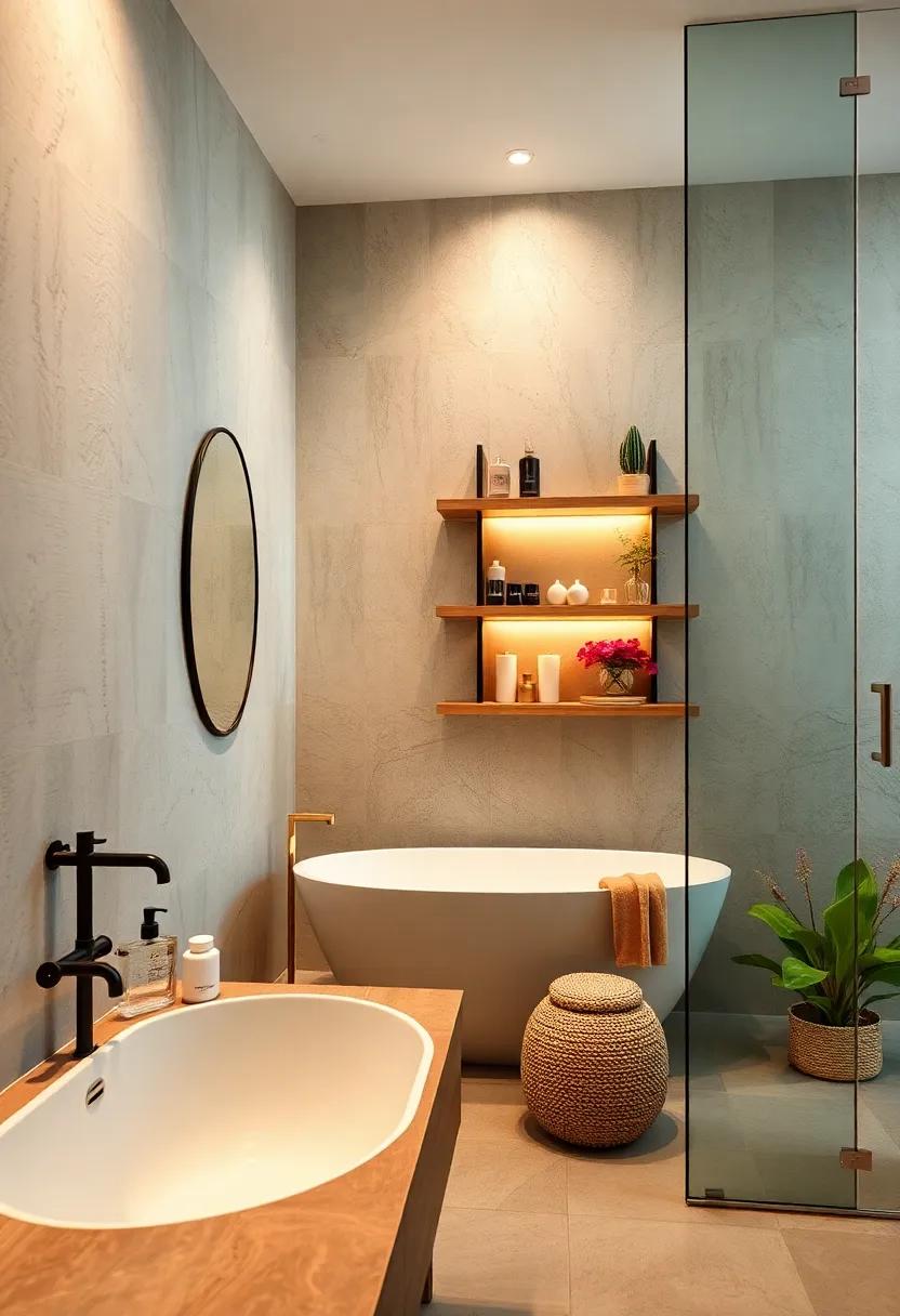 Open shelving is an elegant solution to display your curated collection of spa essentials while enhancing the visual appeal of your bathroom. Imagine a beautifully arranged series of wooden or metal shelves that showcase your favorite items. Use these shelves to exhibit a variety of products, such as luxurious bath oils, soft plush towels, and artisan candles. Pulling these elements together allows you to cultivate a calming atmosphere that reflects your personal style and invites tranquility into your daily routine.