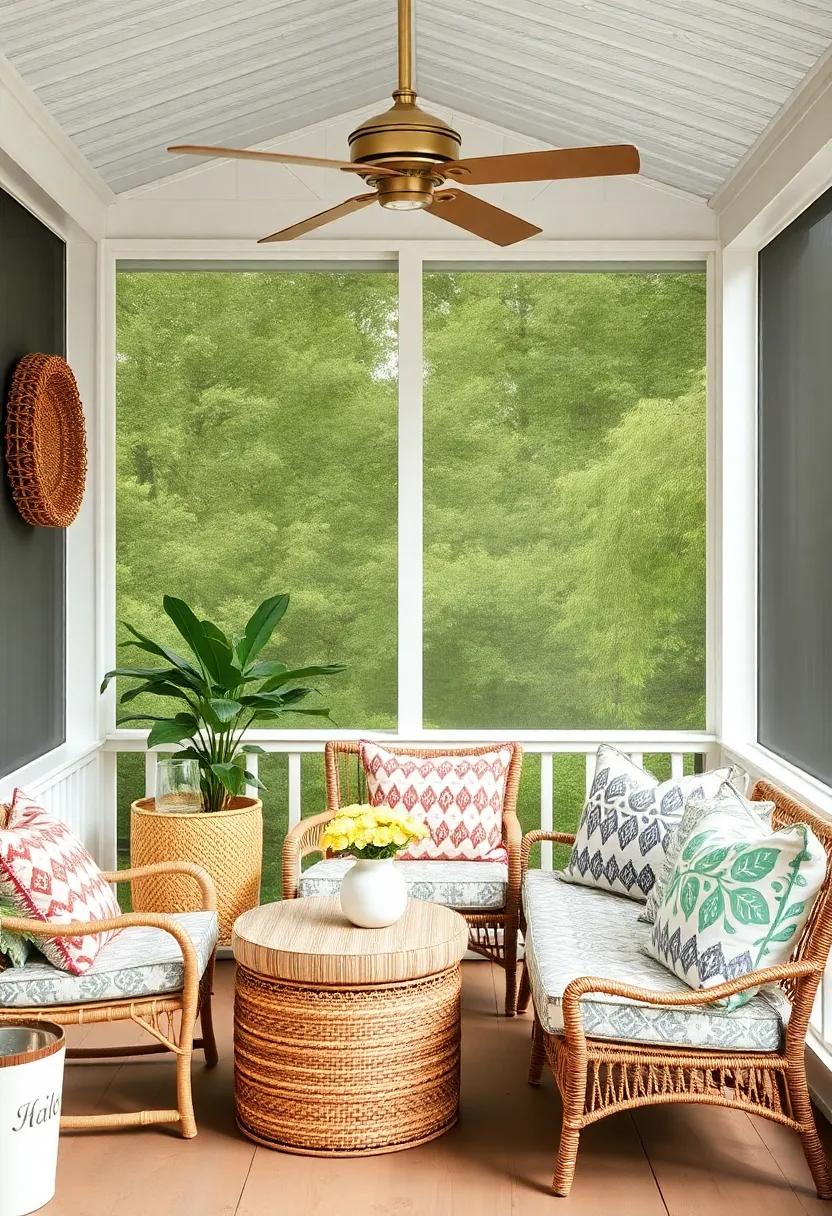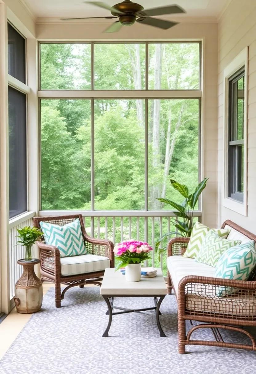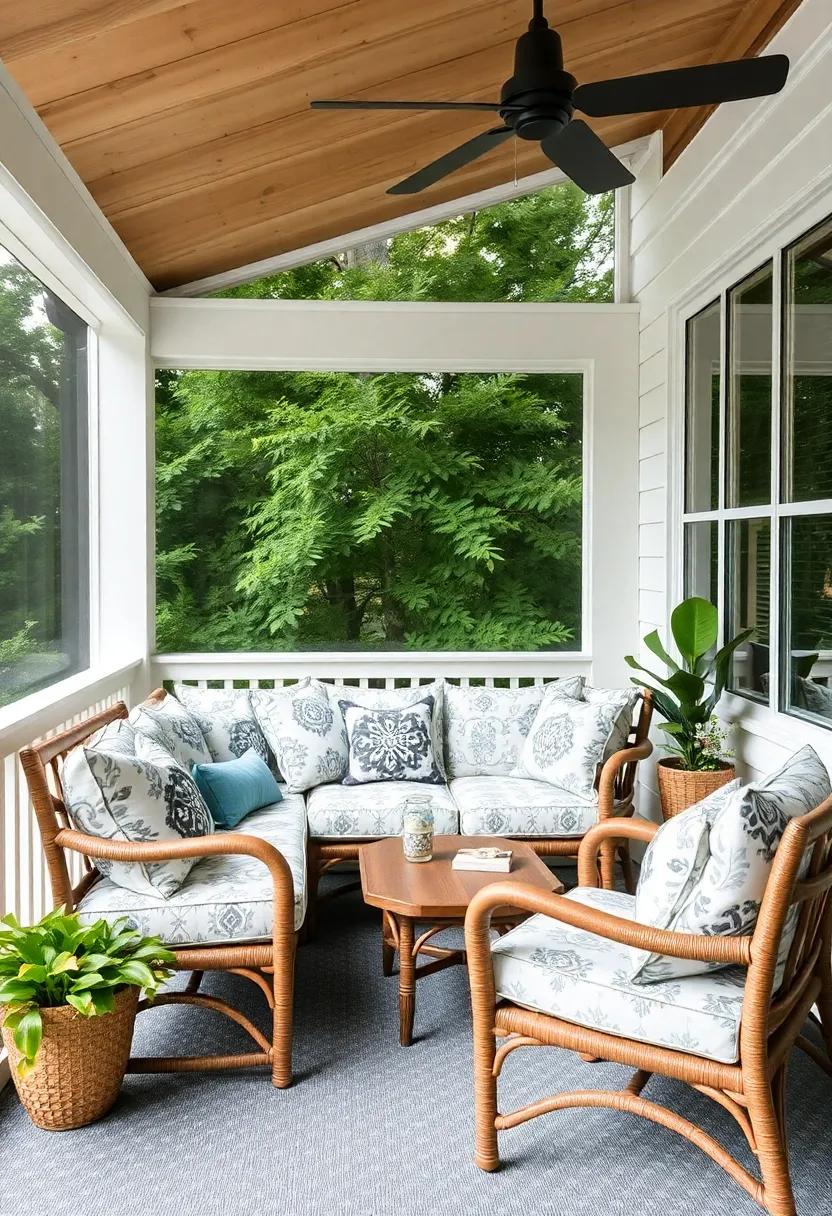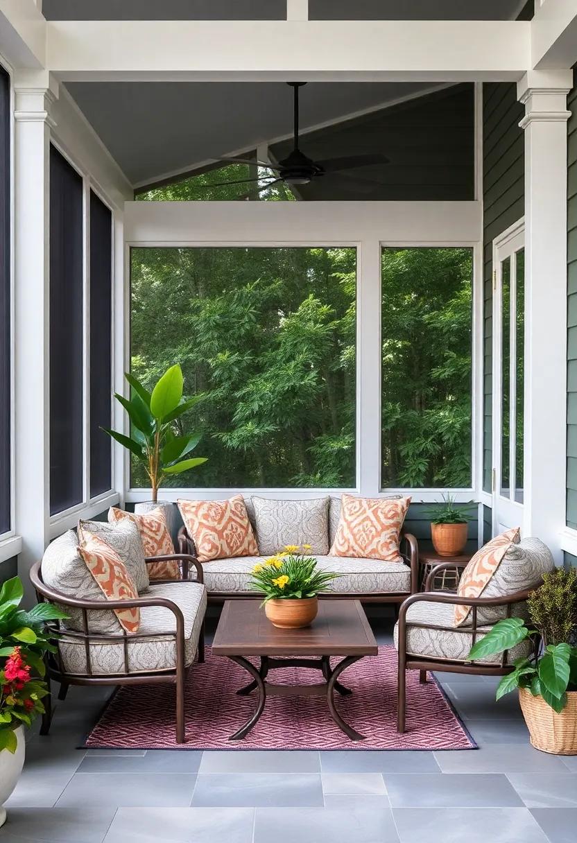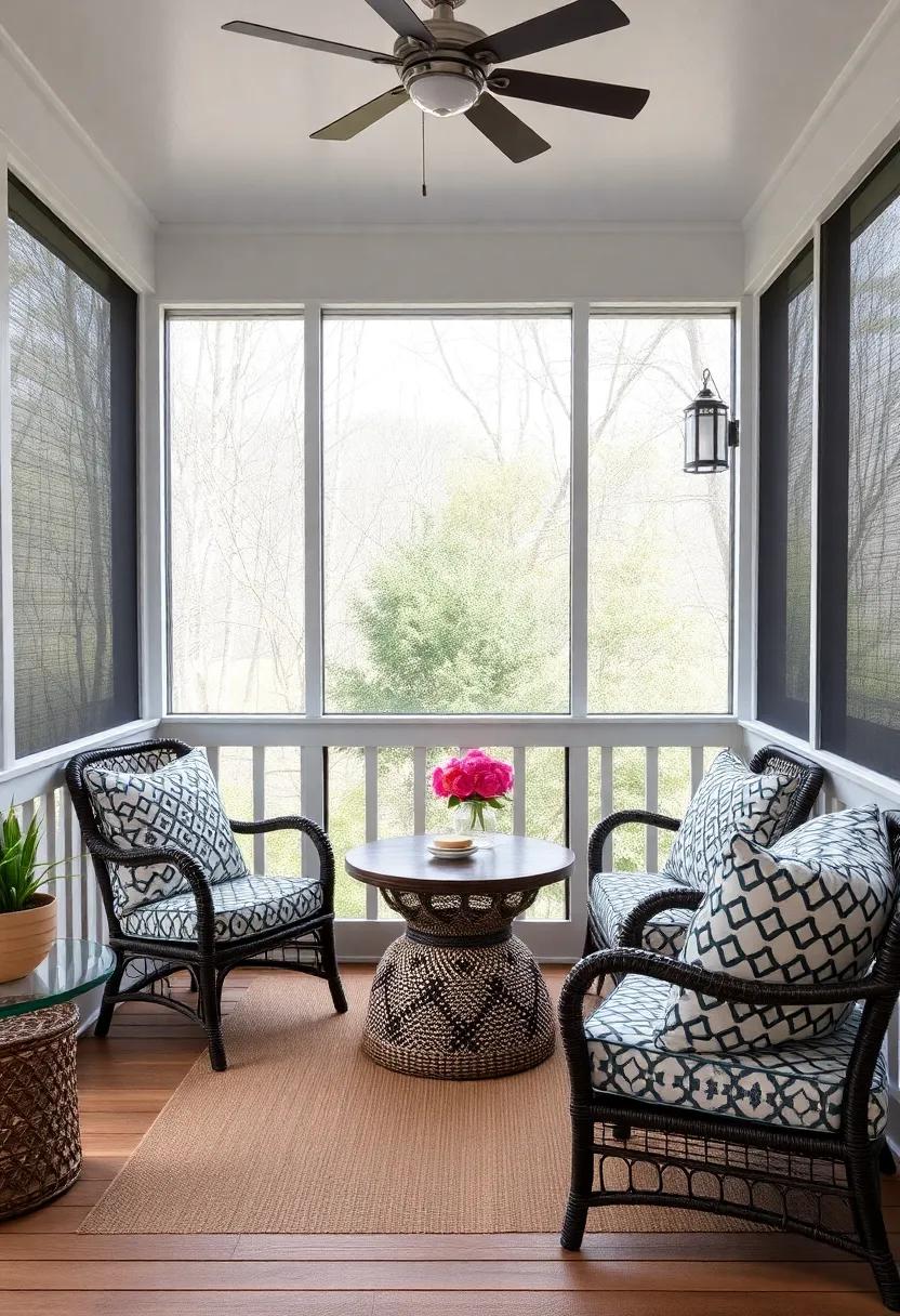 Accessorizing with natural elements can bring a touch of the outdoors inside your screened porch.Consider adding planters with lush greenery or colorful flowers to create a refreshing contrast against your cushions. Hanging lanterns or string lights can create an ethereal glow as dusk settles, enhancing the overall charm of the setting. For functional flair, a stylish coffee table to place drinks and snacks can tie the area together beautifully. The combination of these accessories will not only complement your patterned cushions but also metamorphose your porch into a charming retreat.