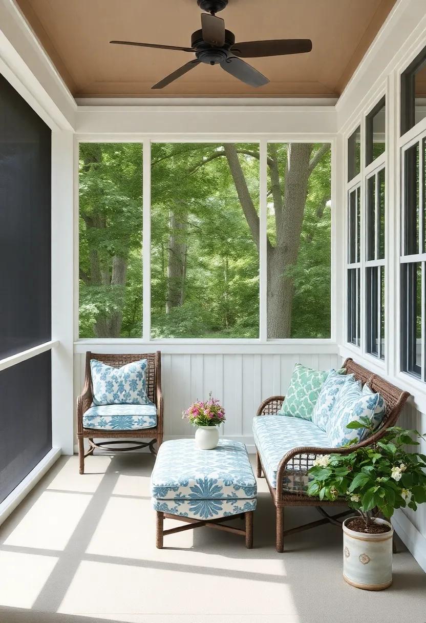 By balancing natural and patterned elements, your screened porch becomes a harmonious blend of comfort and charm, inviting the tranquility of nature right to your doorstep.