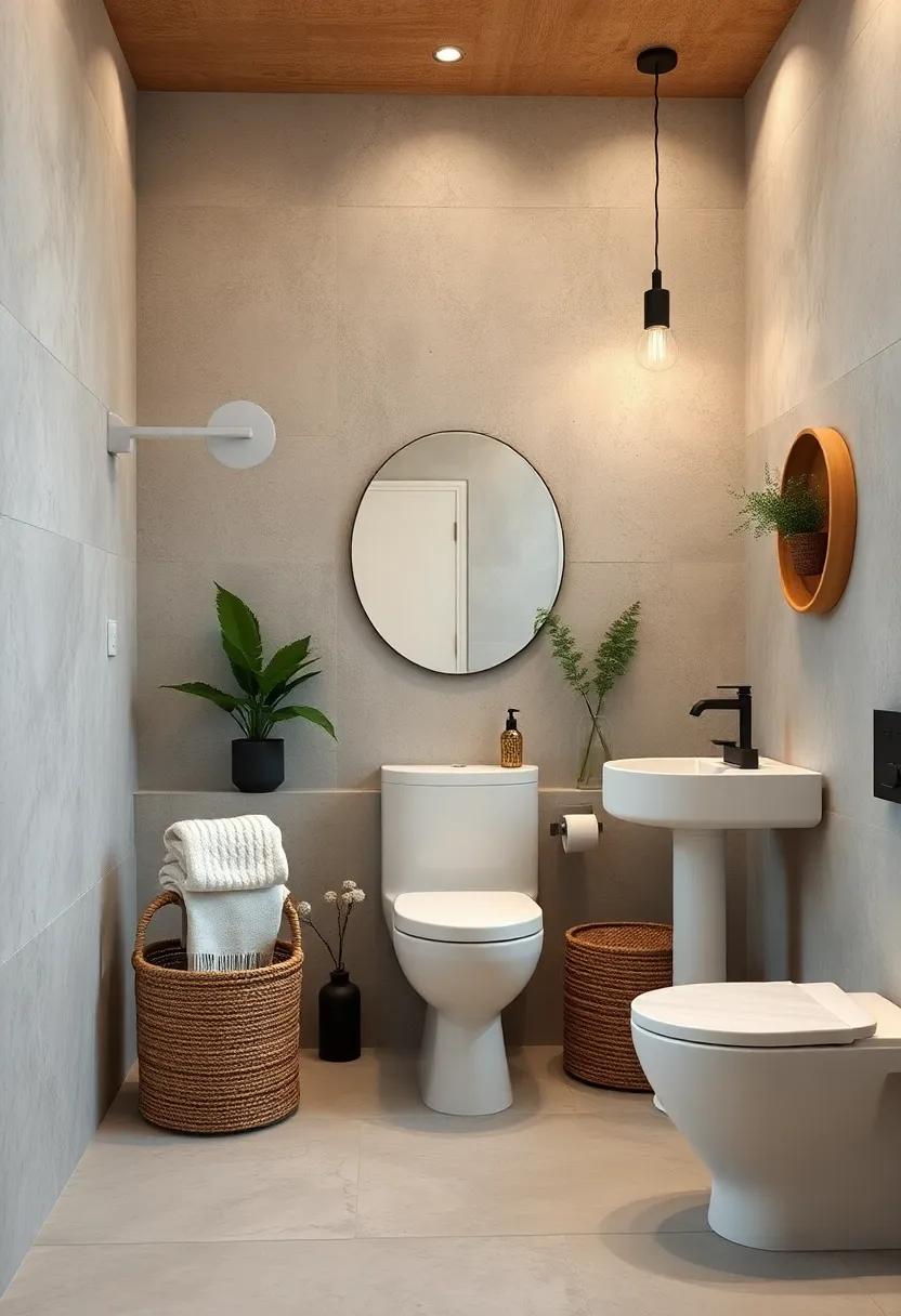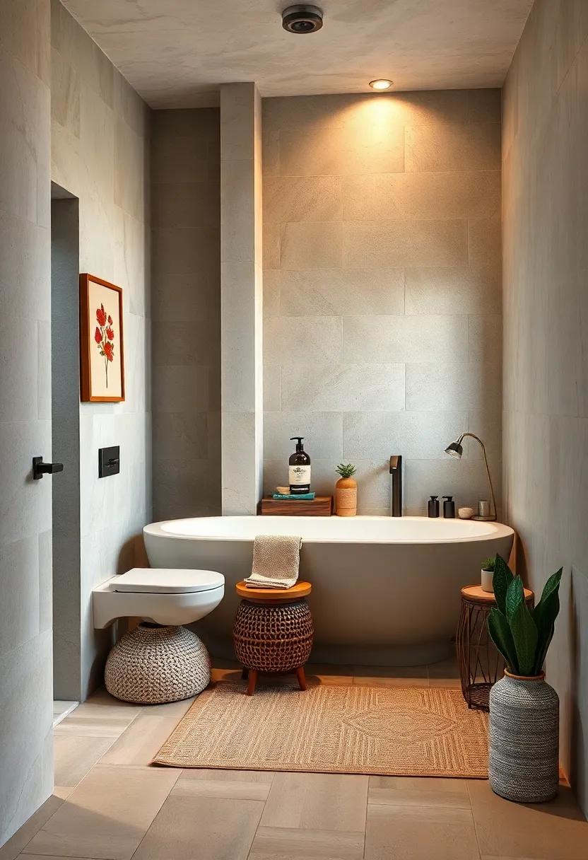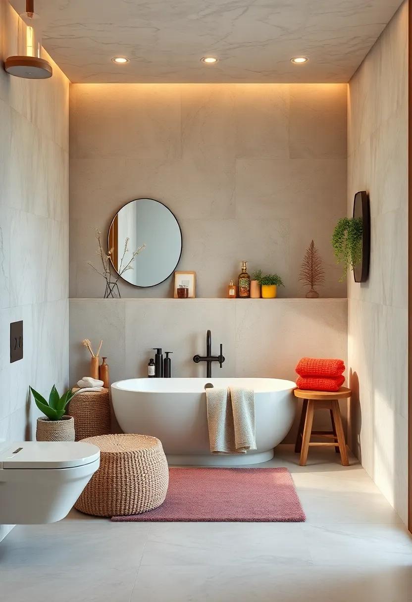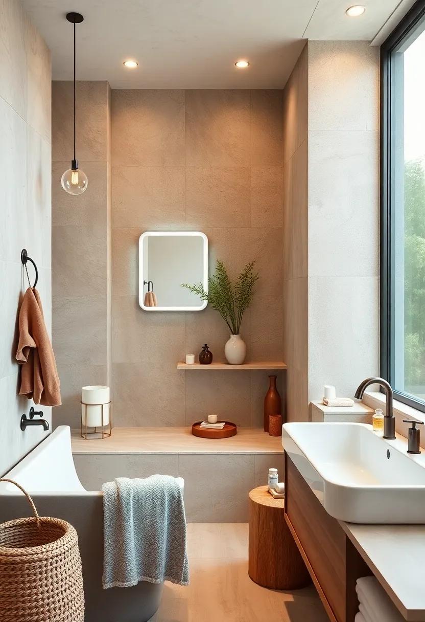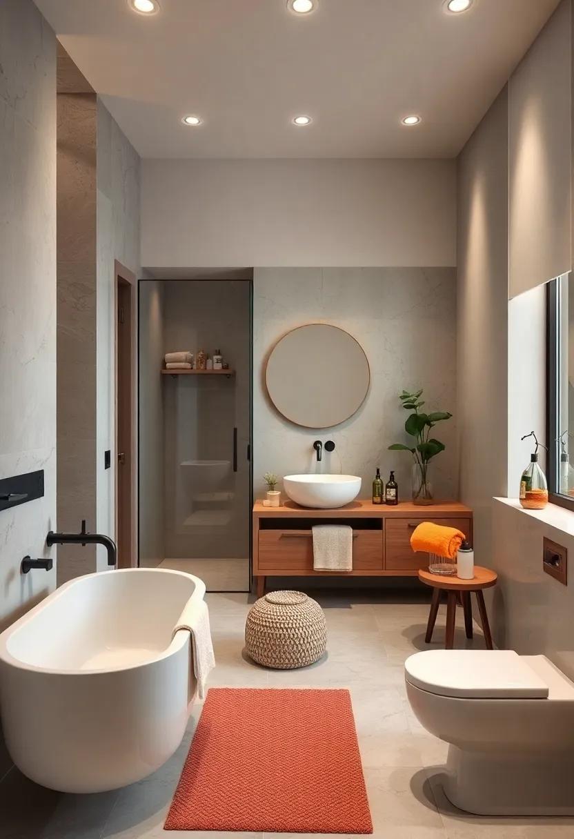 Incorporate multifunctional furniture like a floating vanity or a sleek storage ladder, allowing you to make the most out of every corner. To enhance the cozy appeal, integrate natural elements such as small potted plants, bamboo accents, or wicker baskets for storage. Textured fabrics, like a plush bath mat or soft towels, can also soften the space. Here are a few additional tips to keep your bathroom minimal yet inviting: