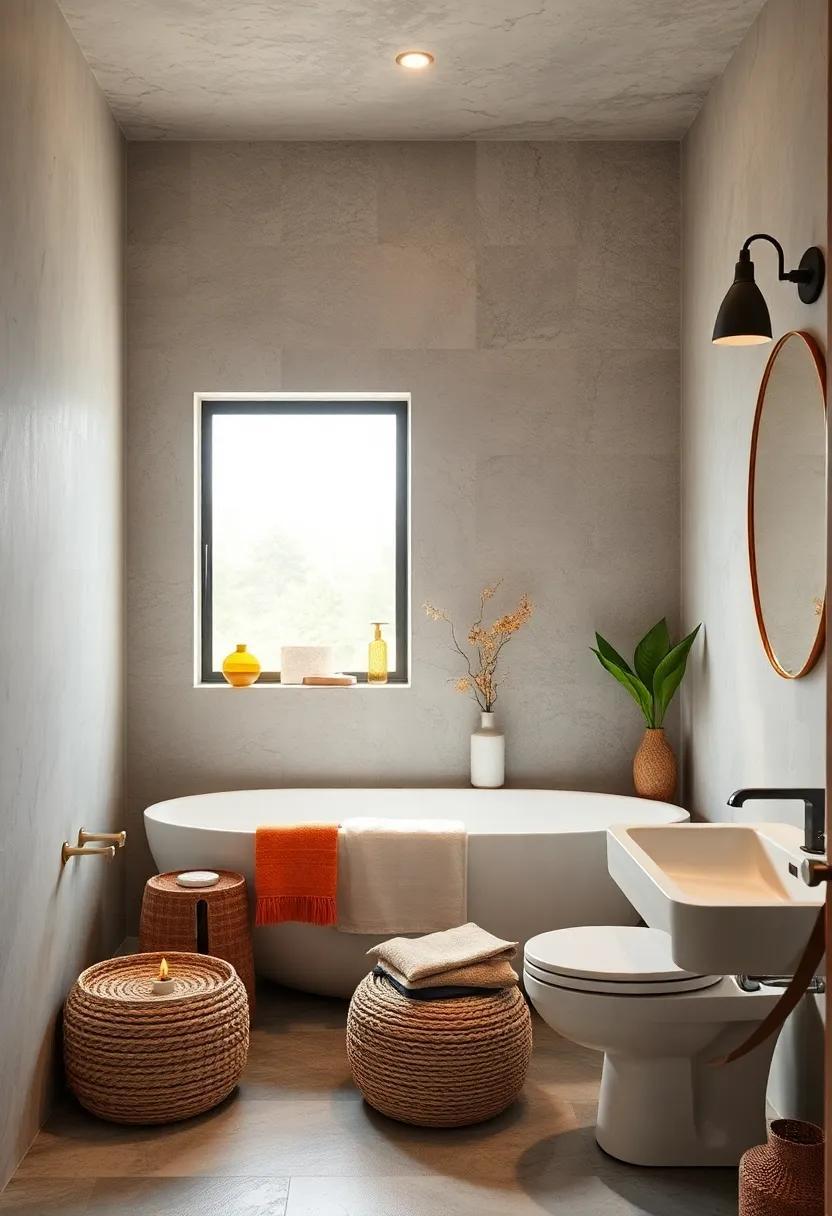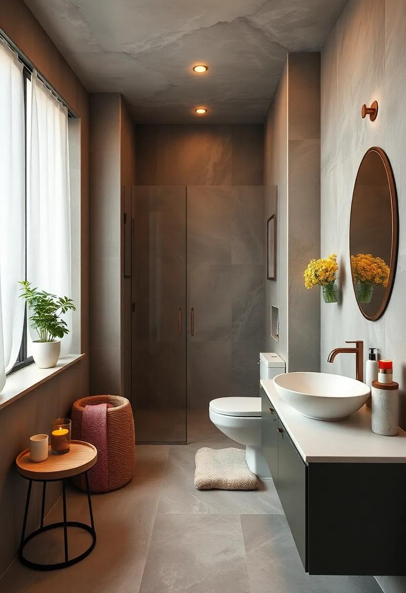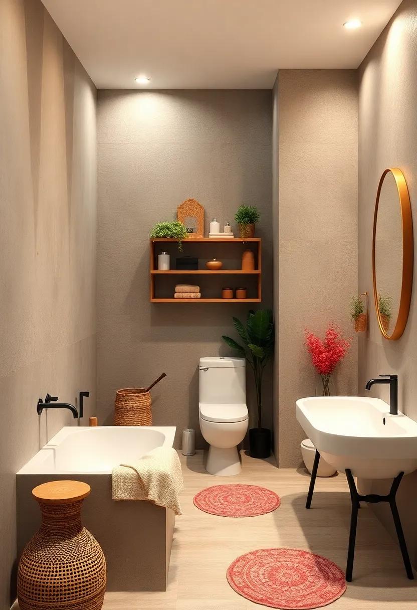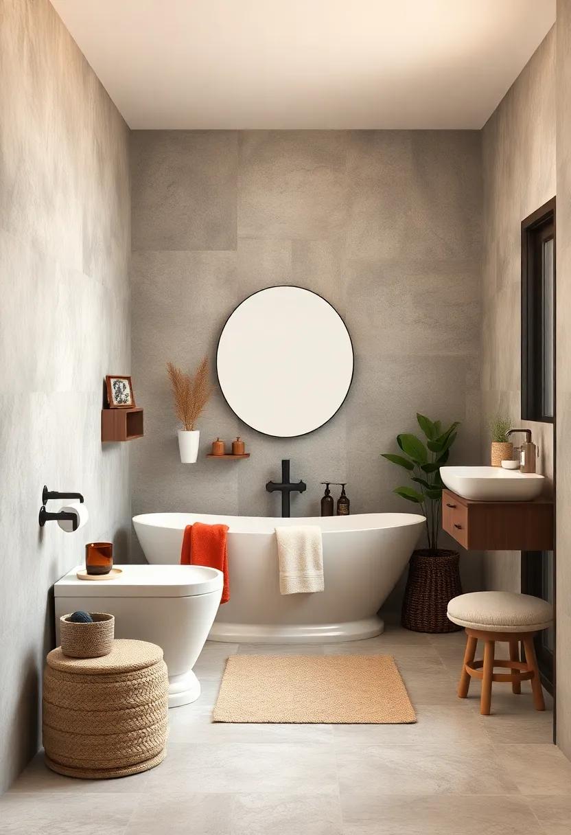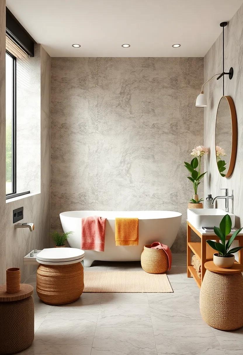 Incorporate multifunctional furniture like a floating vanity or a sleek storage ladder, allowing you to make the most out of every corner. To enhance the cozy appeal, integrate natural elements such as small potted plants, bamboo accents, or wicker baskets for storage. Textured fabrics, like a plush bath mat or soft towels, can also soften the space. Here are a few additional tips to keep your bathroom minimal yet inviting:
