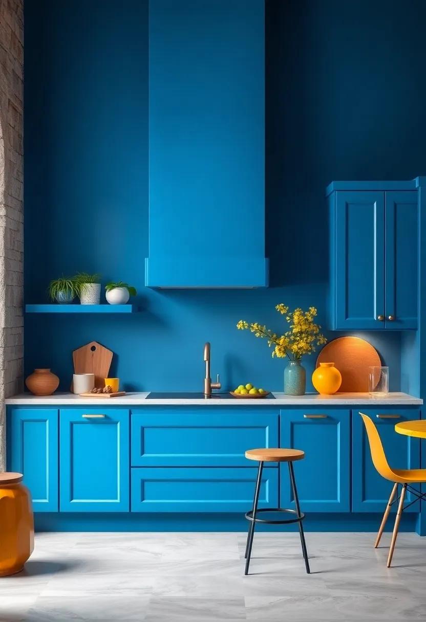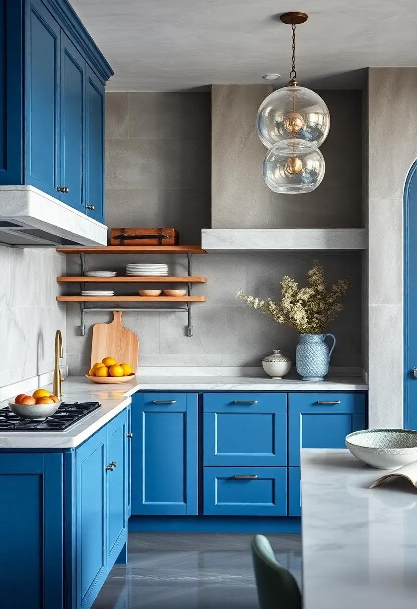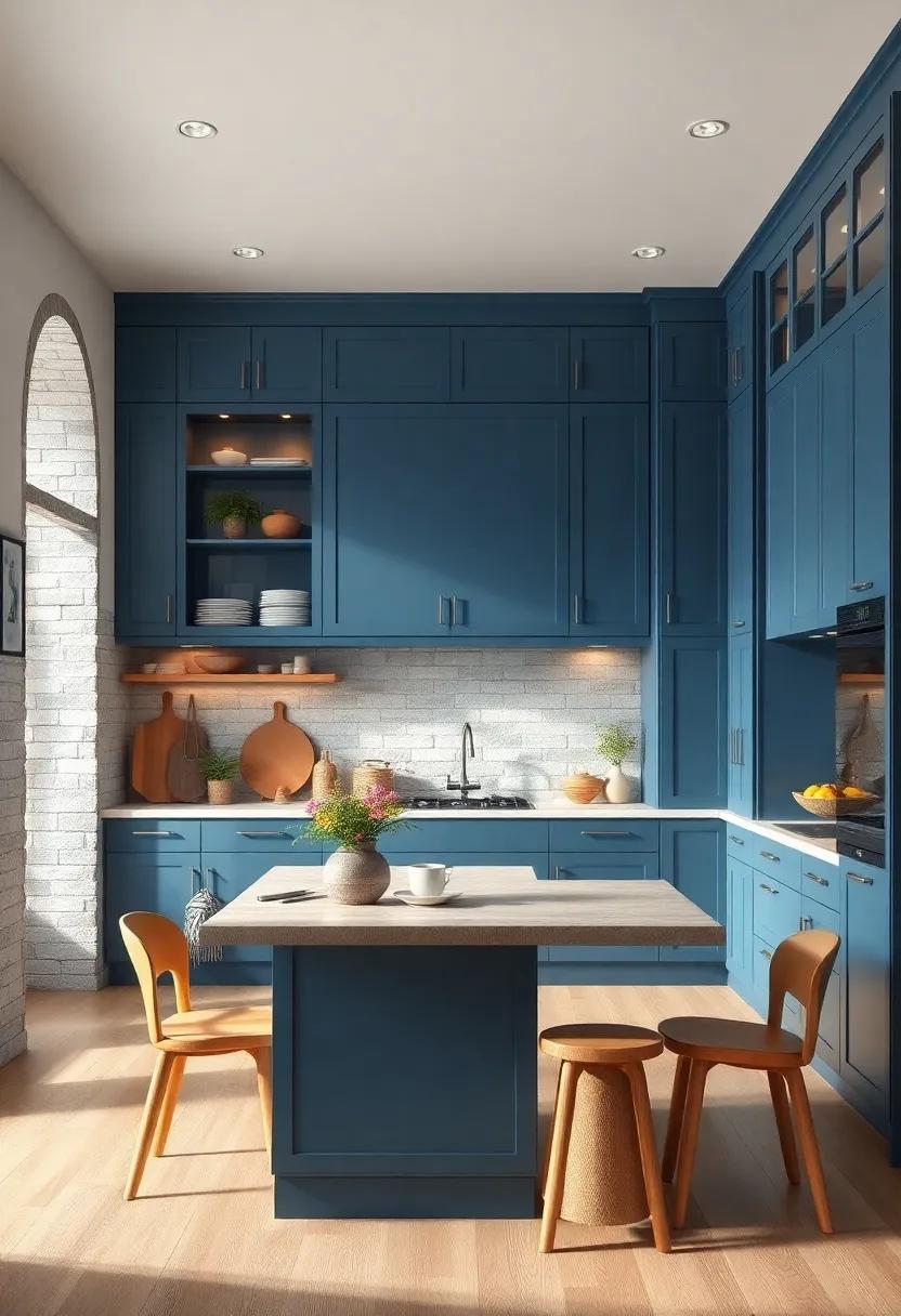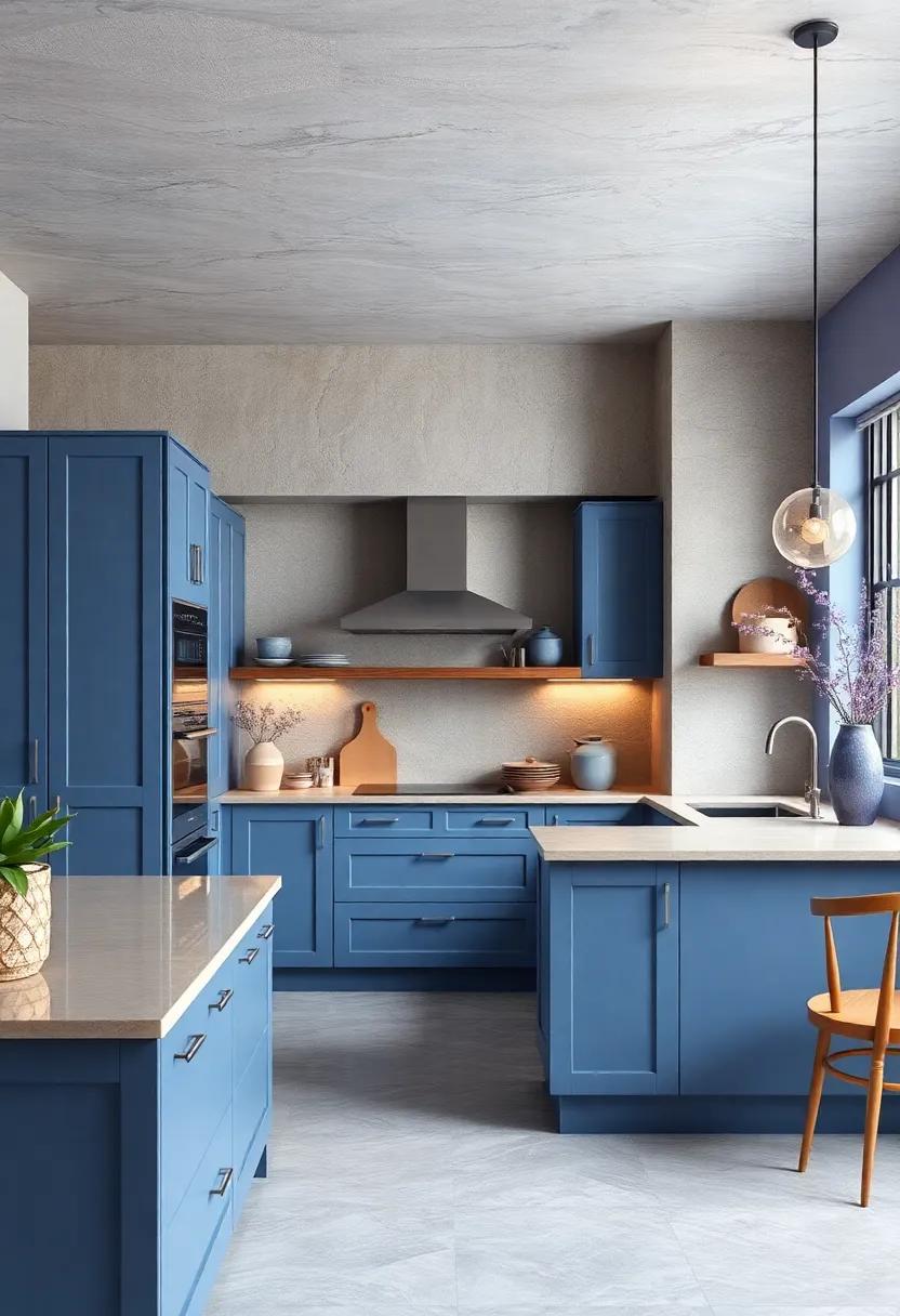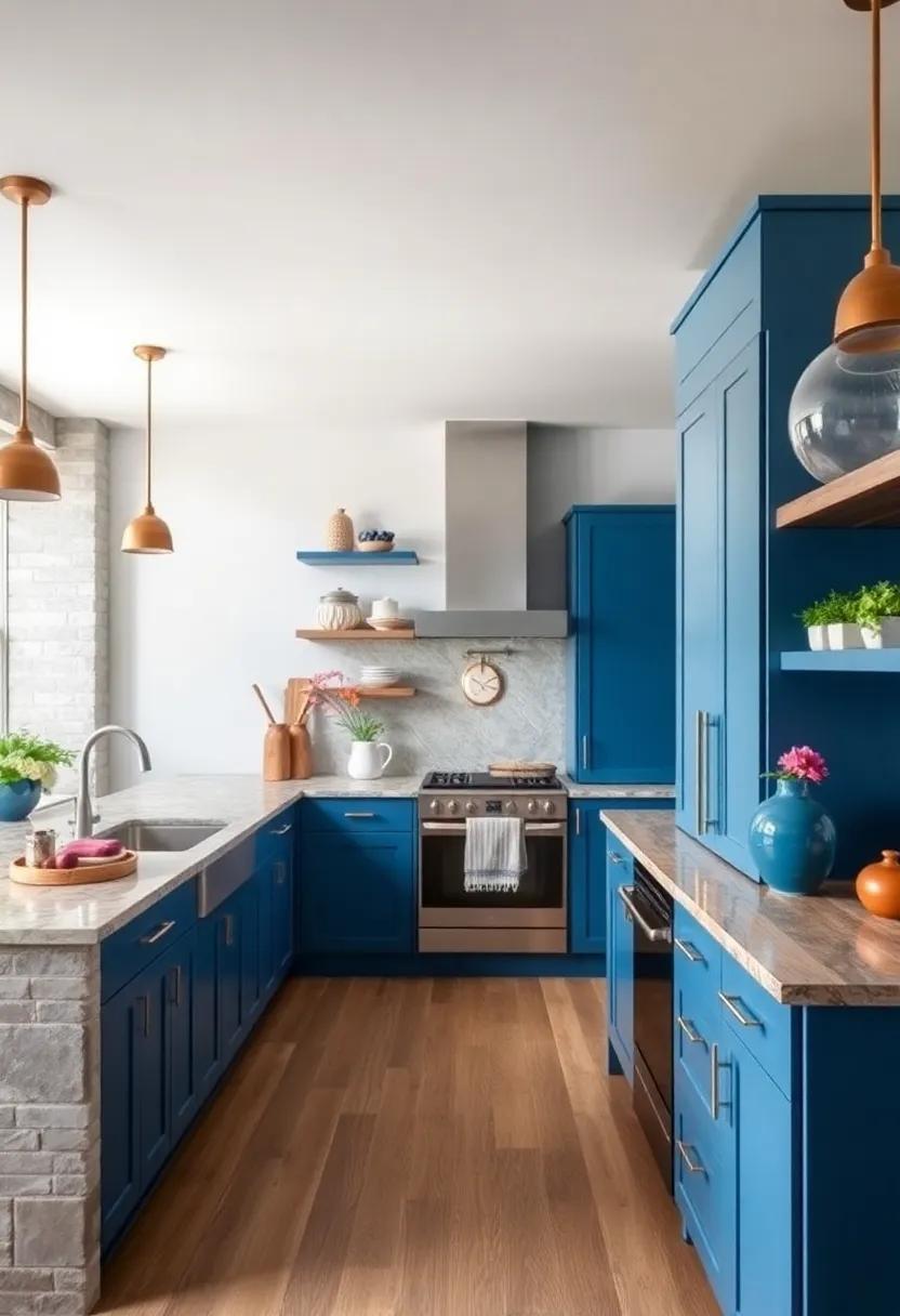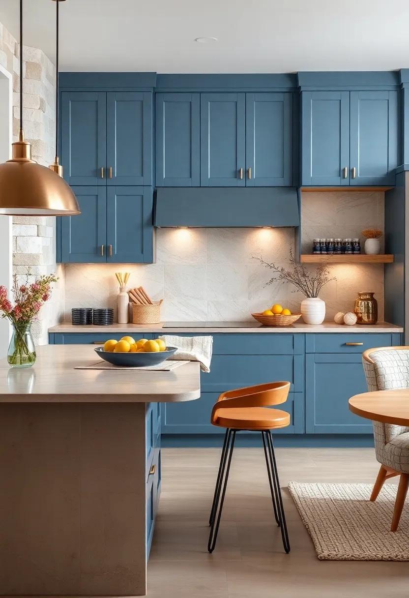 Terracotta tones bring an inviting blend of nature’s warmth and earthy richness, serving as the perfect backdrop for your bold blue kitchen cabinets. The soft, burnt oranges and muted reds not only create a harmonious contrast but also evoke a sense of comfort and coziness. Consider shades like rust, clay, or cinnamon to enhance the visual appeal of your space, making it feel welcoming and lived-in.Incorporating these hues allows your blue cabinetry to stand out while fostering a tranquil atmosphere ideal for both cooking and entertaining.