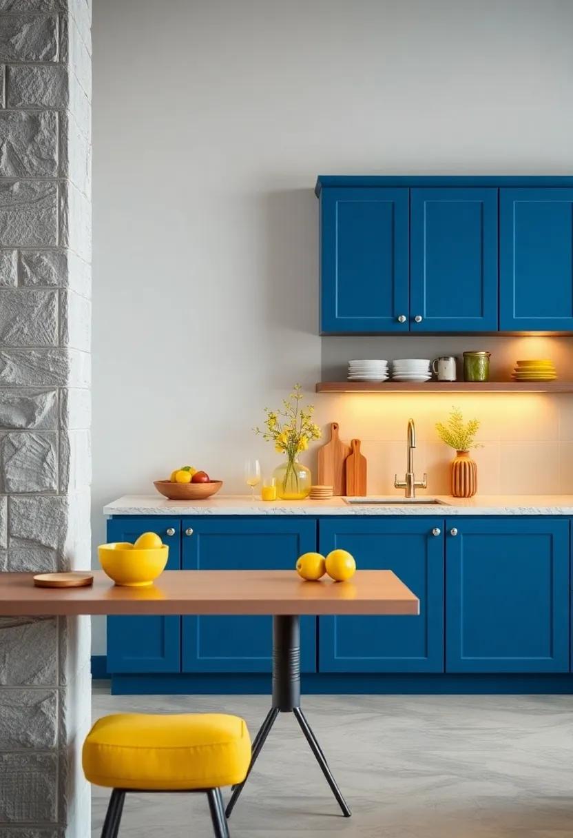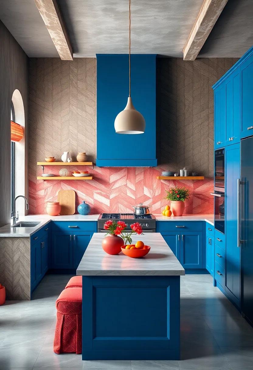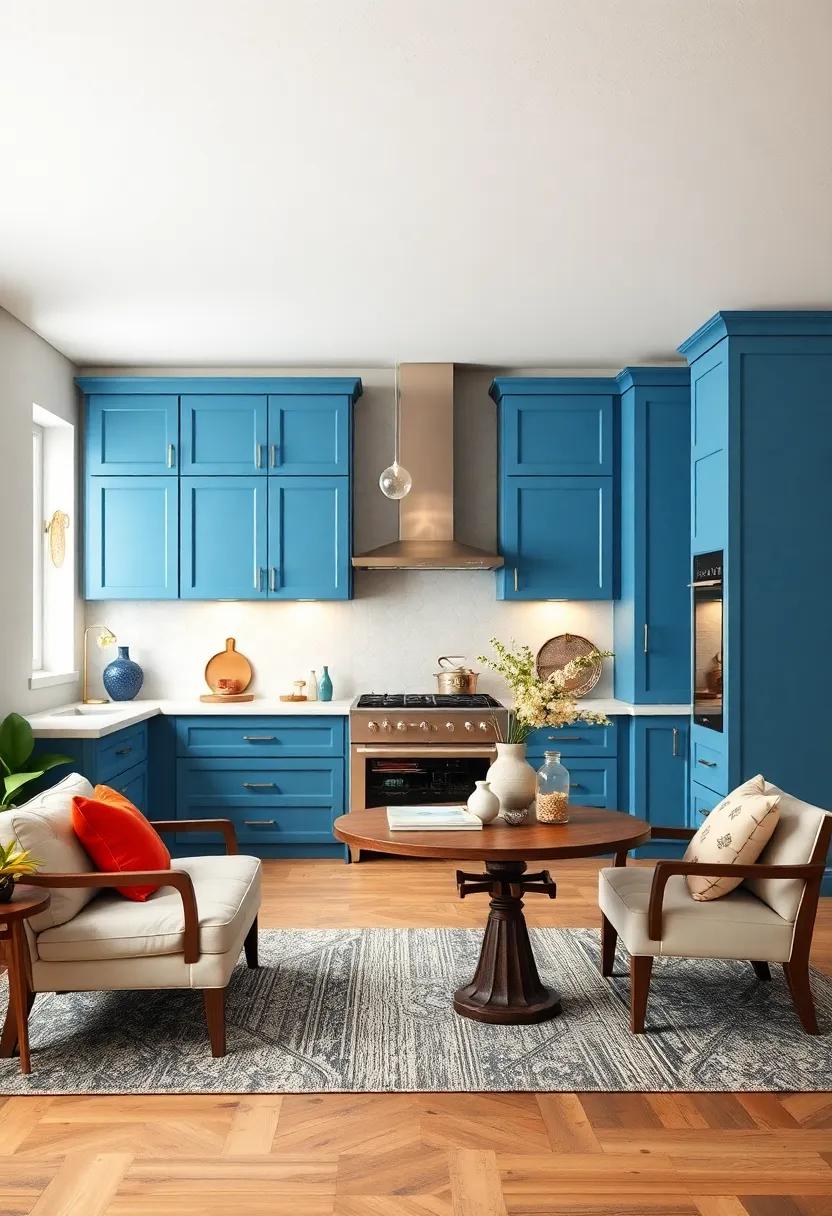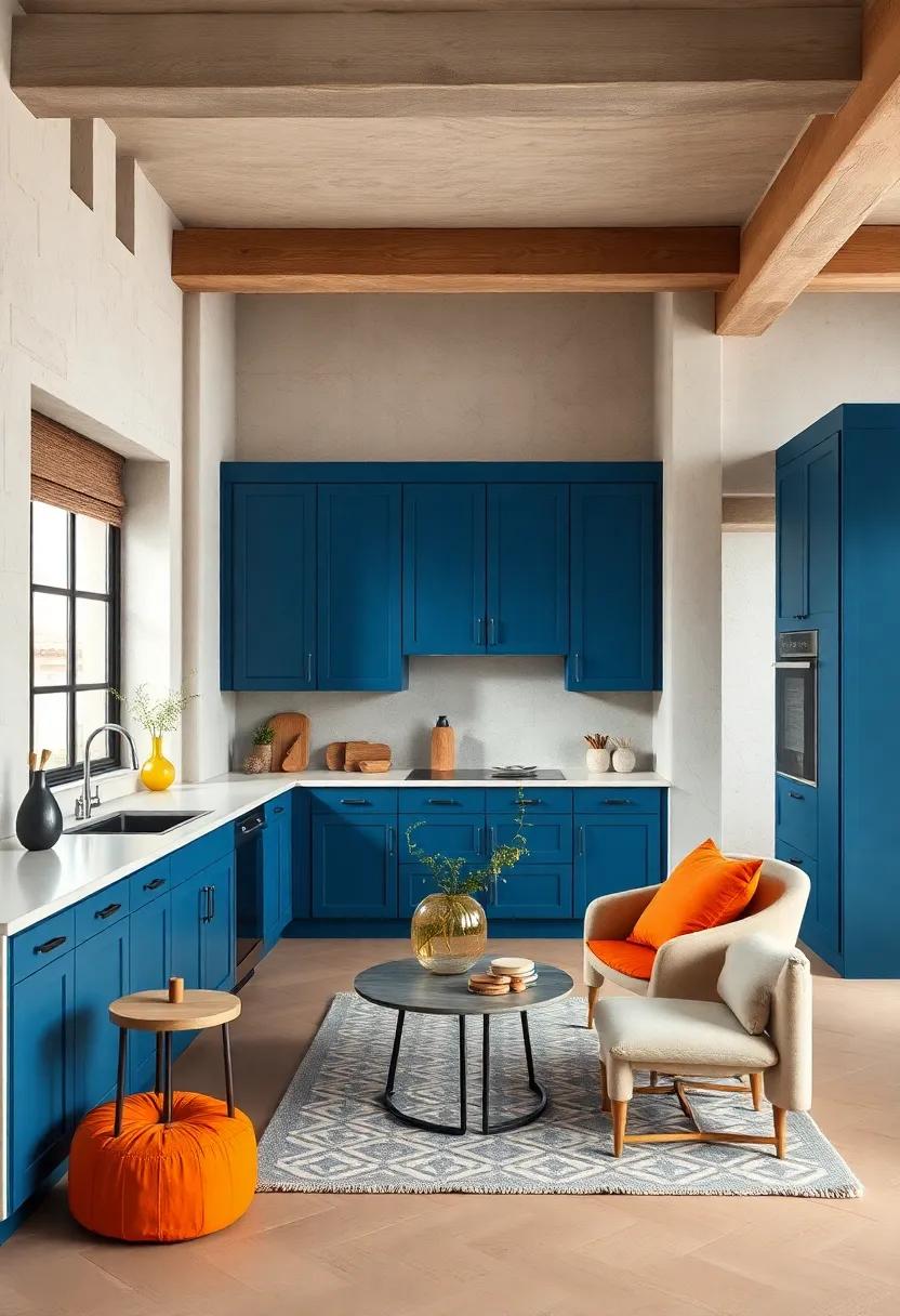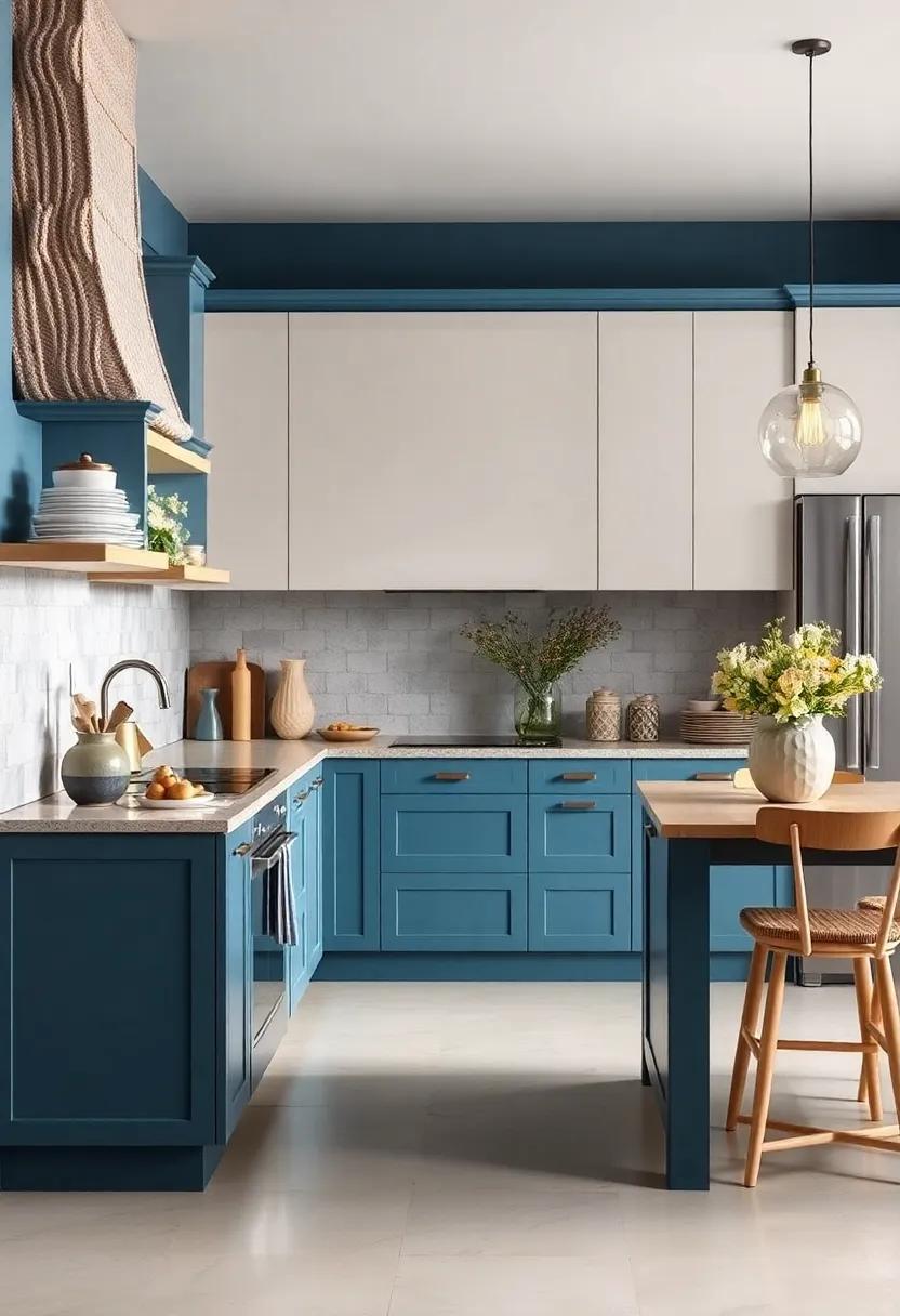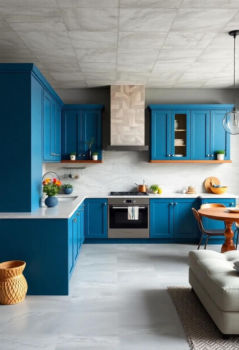 Terracotta tones bring an inviting blend of nature’s warmth and earthy richness, serving as the perfect backdrop for your bold blue kitchen cabinets. The soft, burnt oranges and muted reds not only create a harmonious contrast but also evoke a sense of comfort and coziness. Consider shades like rust, clay, or cinnamon to enhance the visual appeal of your space, making it feel welcoming and lived-in.Incorporating these hues allows your blue cabinetry to stand out while fostering a tranquil atmosphere ideal for both cooking and entertaining.
