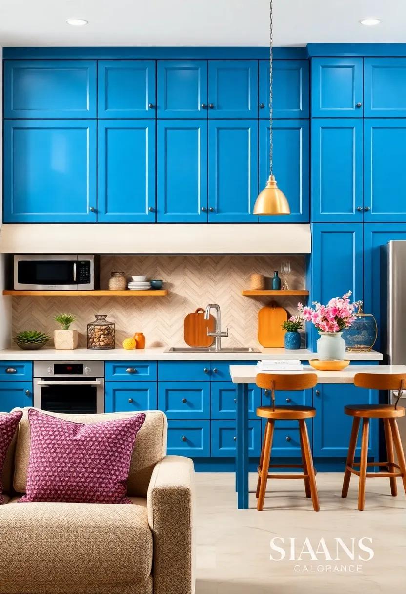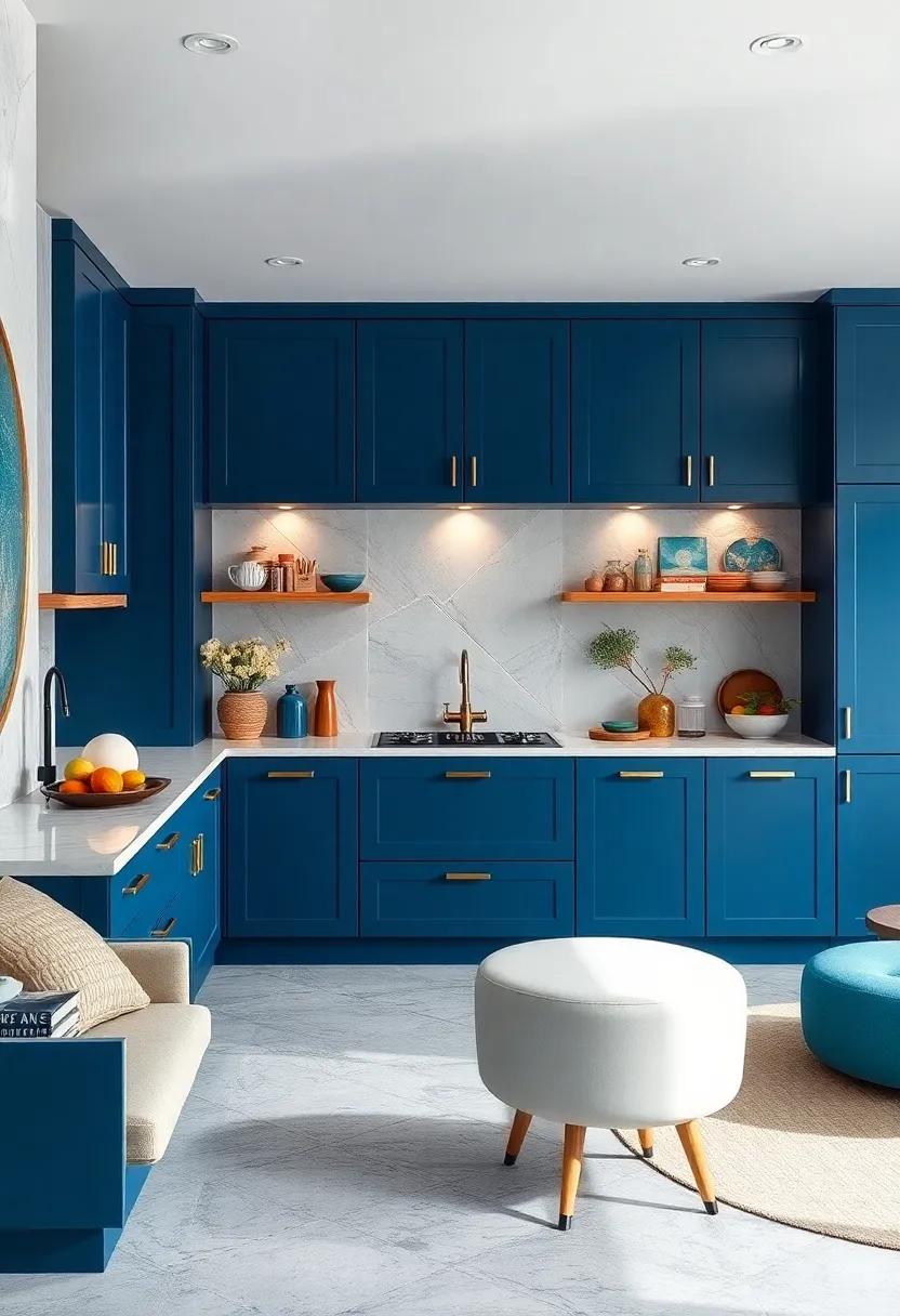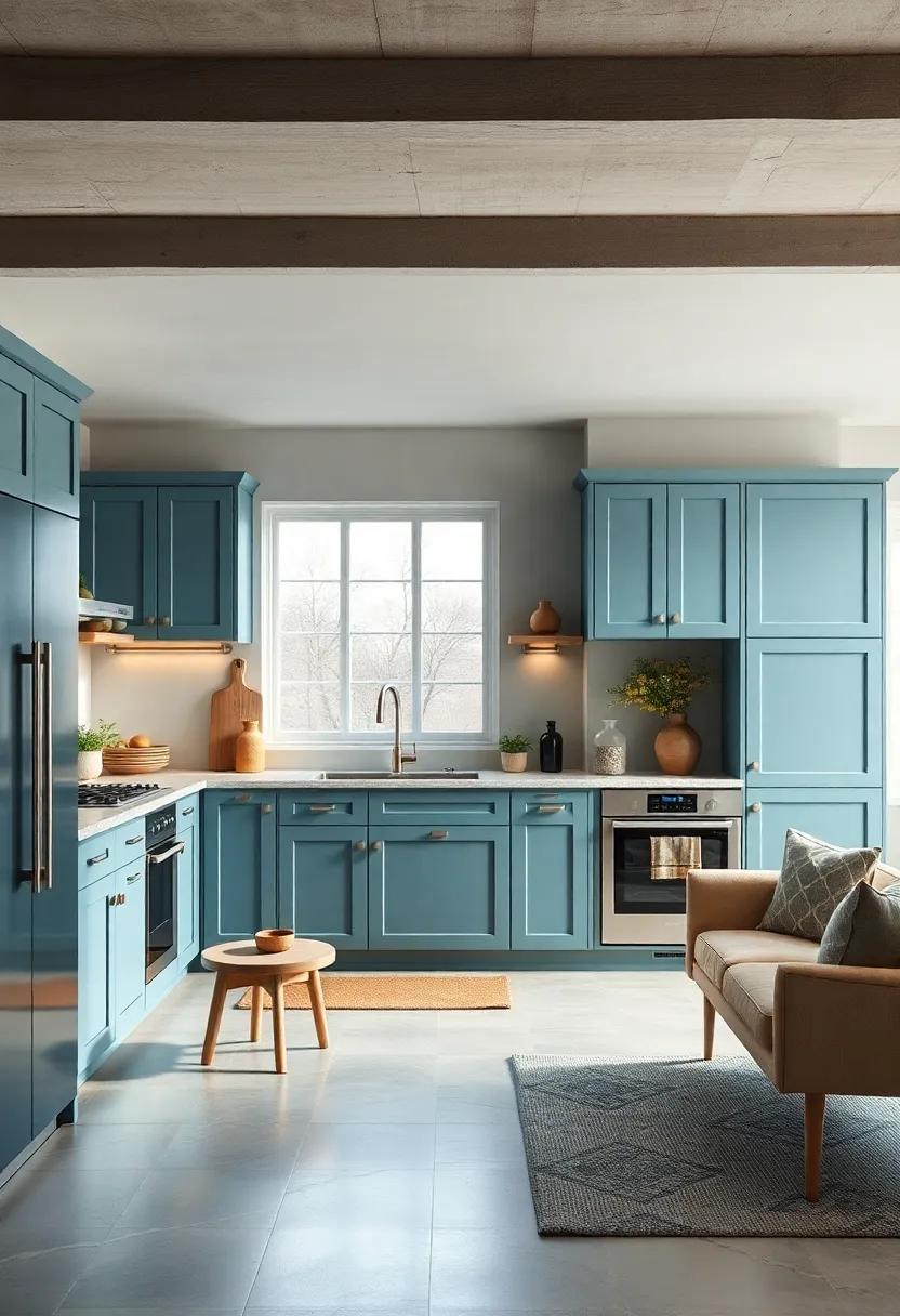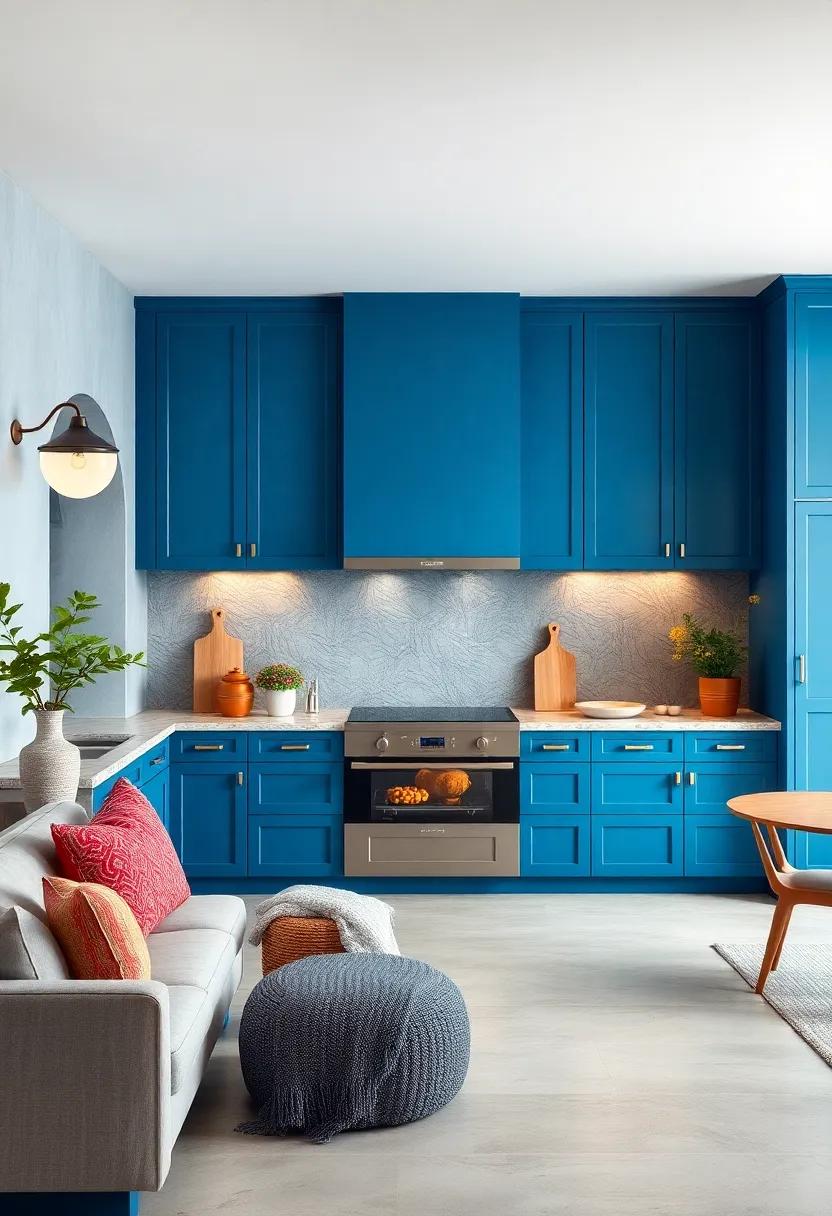imagine walking into a kitchen that feels as inviting as a warm embrace. To achieve this, consider embracing warm gradient hues that seamlessly infuse comfort with contemporary style. Shades like soft corals, gentle peaches, and muted yellows can create a stunning contrast against your blue kitchen cabinets, drawing the eye to their vibrant tones while establishing a cozy, welcoming environment. These colors harmonize beautifully, allowing the cabinetry to stand out as the focal point of the room without overwhelming the senses. With the right balance, your kitchen can reflect both a modern aesthetic and the warm comfort of home.