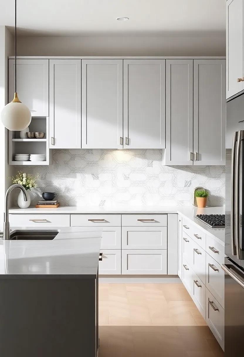 Don’t shy away from experimenting with textiles and accessories either. Swapping traditional textiles for modern ones can elevate the overall aesthetic.Think about adding a geometric-patterned rug or textured curtains in a complementary shade. Such details can make a striking focal point amidst the subtle gray backdrop. Moreover, integrating glass shelves or ceramic tiles with an intricate design can provide depth, making the kitchen feel both luxurious and layered. By thoughtfully selecting contrasting textures, you’ll create a dynamic yet cohesive environment that defines your light gray kitchen with style and sophistication.