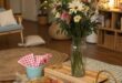 Soft gray towels combined with vibrant floral accents create a rejuvenating environment. Labeled dispensers and natural materials offer a chic twist on everyday necessities.