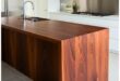 Combining deep lower cabinets with light wood uppers creates a layered aesthetic. The marble waterfall island offers additional prep and dining space, while slender brass pendant lights provide ambient illumination without cluttering the ceiling.