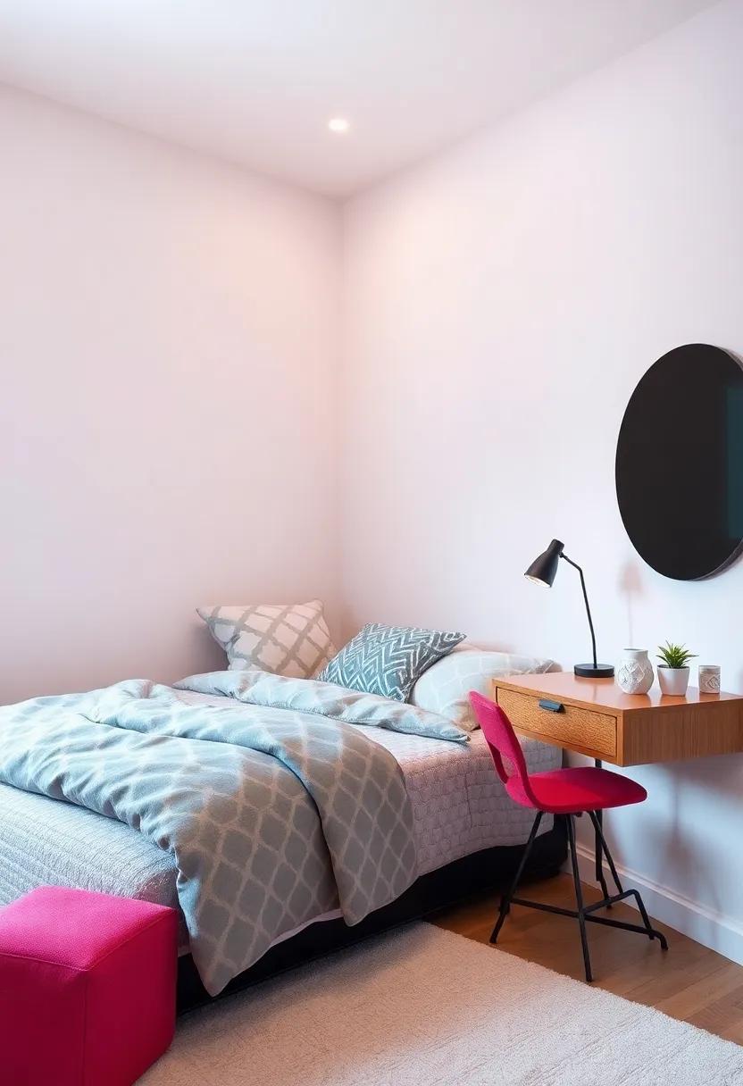 Additionally, creating a small designated workspace can elevate productivity without compromising style. A streamlined, minimalist desk with a chic chair encourages focus while complementing the overall glam aesthetic. Integrating a few organizational items, like colorful file holders and a stylish desk lamp, can make this workspace not only functional but also visually appealing. To enhance the ambiance, engaging wall decals or a fun gallery wall of personal art can add character and inspiration. Consider a modular stool that can be easily tucked away when not in use, ensuring that every inch of space feels intentional and well-curated.