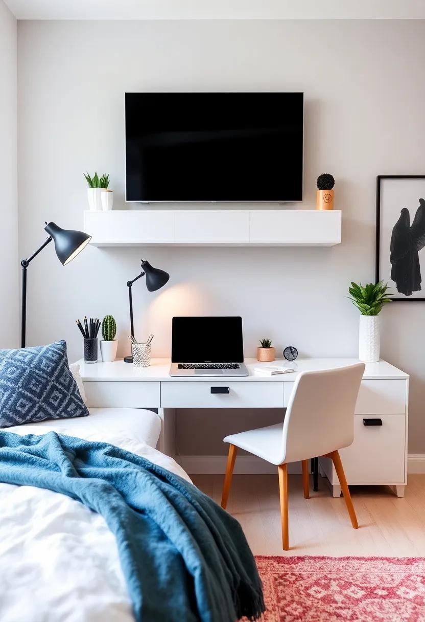 create an inspiring workspace in your small room by incorporating a stylish desk solution tailored for creativity and productivity. Opt for a floating desk that can be mounted on the wall, providing ample workspace while maximizing floor area. Choose one with built-in shelving to store stationery and decorative items,keeping everything within reach and organized.Consider a color palette that complements your bedroom aesthetic—soft pastels or bold jewel tones can add character without overwhelming the space. Pair your desk with a chic, ergonomic chair that encourages long hours of creative flow, such as a modern acrylic design or a vintage-inspired piece. Add a touch of greenery with a small potted plant on your desk to create a refreshing ambiance that sparks inspiration.